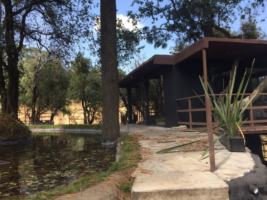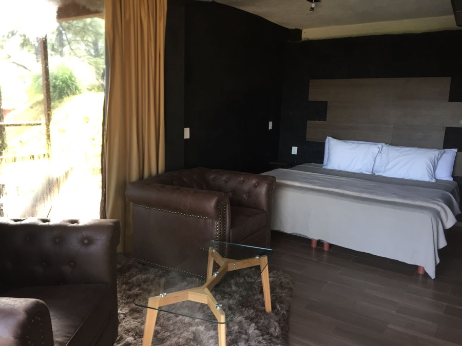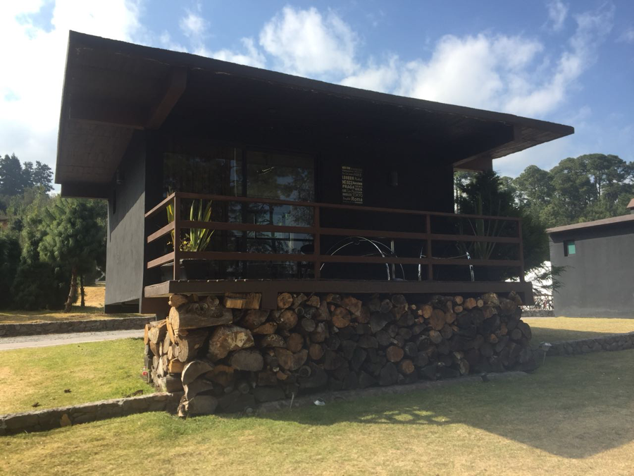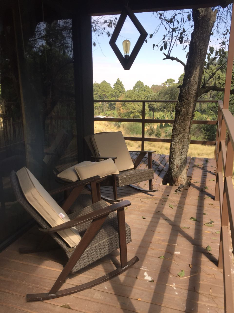 Cada cabaña tiene su espacio y privacidad, puedes cerrar las cortinas y desaparecer inclusive del mismo Ajusco… pero también una terraza (con sillas muy cool) donde puedes salir a respirar aire fresco y admirar la hermosa vista desde lo alto del Ajusco hacia las montañas y los árboles y compartir un drink con tu acompañante…