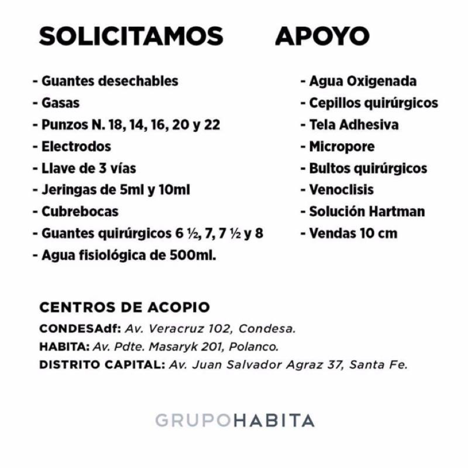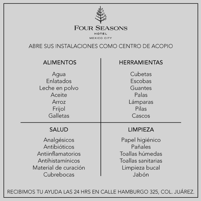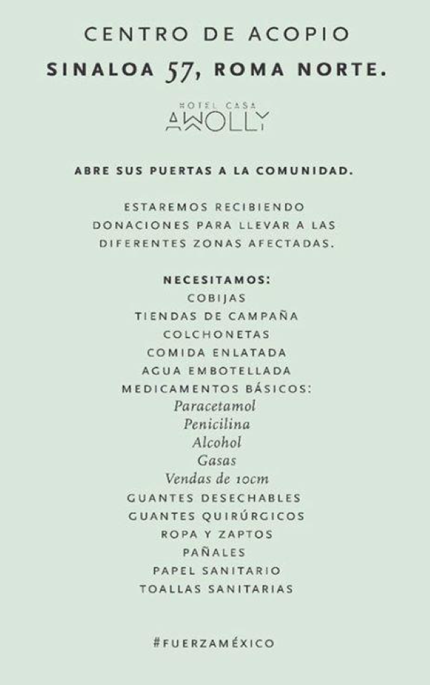 Sus cuatro sucursales en la CDMX -Distrito Capital, Habita, Condesa DF y Downtown- funcionan como centro de acopio, asimismo se encargan de distribuir alimento y agua a los voluntarios.