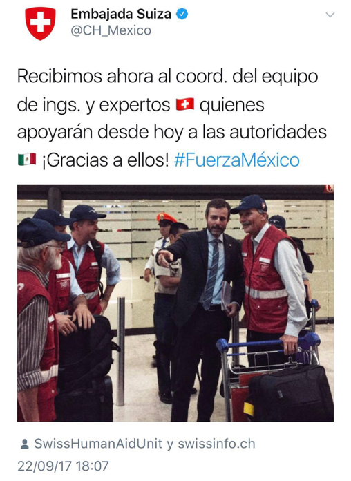 Por otra parte, el gobierno de México estaba decidido a utilizar a ingenieros capacitados en las labores de detección de daños de los edificios después del sismo, al mismo tiempo, suiza ofreció enviar un grupo de ingenieros para apoyar en esta labor, de primer momento México declinó la oferta, agradeciéndoles el apoyo, pero luego de unas horas aceptó, comunicando por medio de tuits que se estaban definiendo detalles y esperaban su pronta llegada.