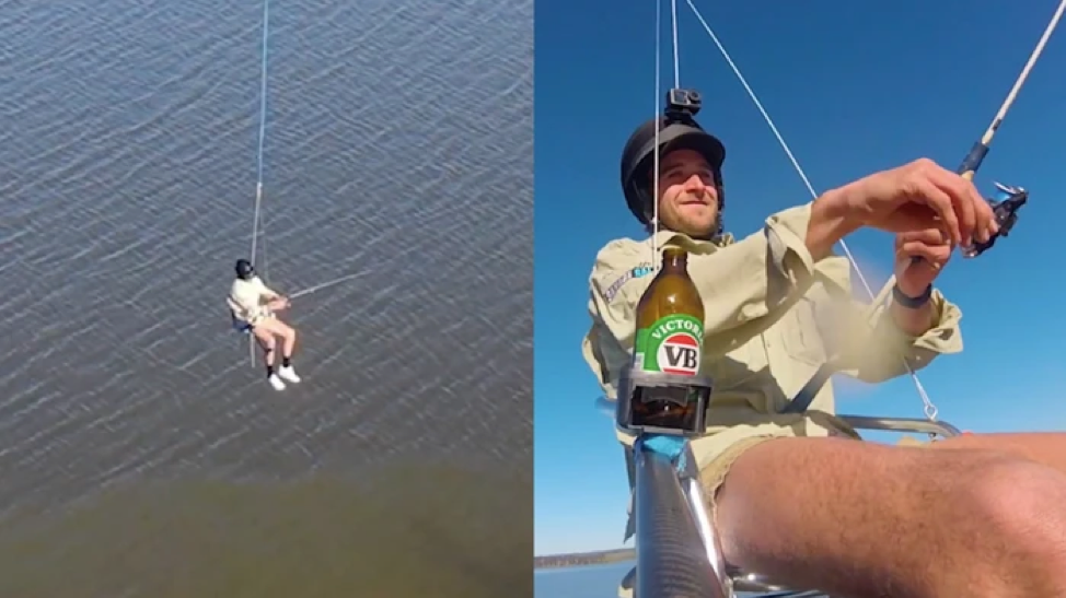 Este video grabado en Upper Coliban, Australia, fue subido por la cuenta de Facebook de UAV Me y nos muestra las pruebas que realiza el sujeto antes de sentarse en la silla para ser elevado varios metros sobre el agua con su cerveza en una mano y su caña de pescar en la otra para finalmente regresar victorioso y a salvo a la orilla con su pesca. Como era de esperarse, el video se hizo viral rápidamente y las autoridades no tardaron en notarlo…